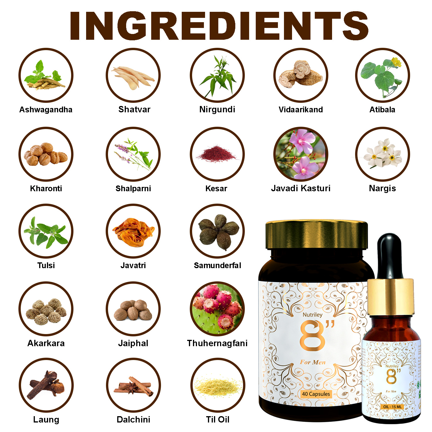 Kesar 500 mcg, Javadi Kasturi 500 mcg, Nargis 500 mcg, Tulsi 500 mcg, Javatri 600 mcg, Samunderfal 600 mcg, Akarkara 600 mcg, Jaiphal 900 mcg, Thuhernagfani/ Vajarkantka 10 mg, Laung 10 mg, Dalchini 50 mg, Til Oil Q.S.