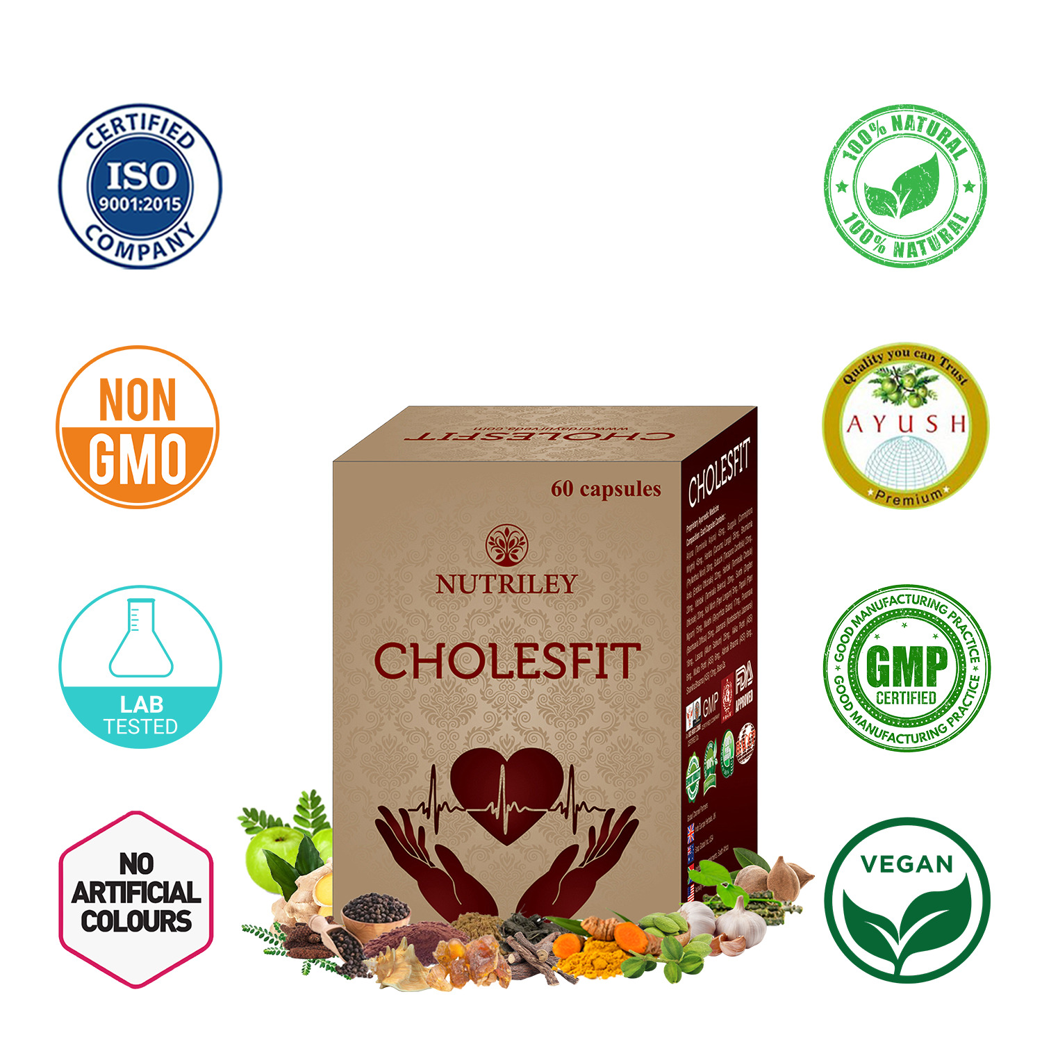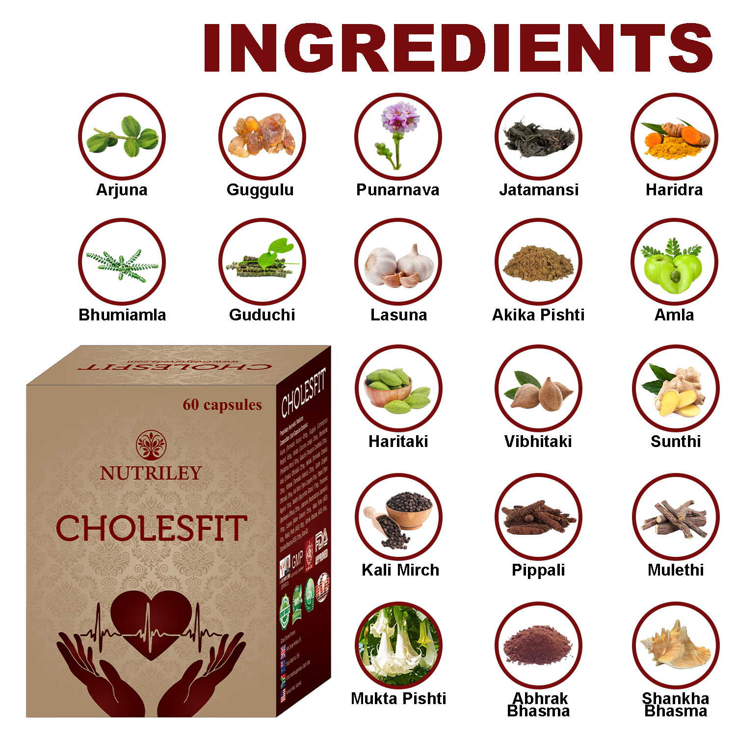 Arjuna (Terminalia Arjuna) 45 Mg, Guggulu (Commiphora Wrightii) 45 Mg, Haridra (Curcuma Longa) 35 Mg, Bhumiamla (Phyllanthus Niruri) 30 Mg, Guduchi (Tinospora Cordifolia) 23 Mg, Amla (Emblica Officinalis) 22 Mg, Haritaki (Terminalia Chebula) 20 Mg, Vibhitaki (Terminalia Belerica) 20 Mg, Sunthi (Zingiber Officinale) 20 Mg, Kali Mirch (Piper Longum) 5 Mg, Pippali (Piper Nigrum) 15 Mg, Mulethi (Glycyrrhiza Glabra) 17 Mg, Punarnava (Boerhaavia Diffusa) 25 Mg, Jatamansi (Nardostachys jatamansi) 18 Mg, Lasuna (Allium sativum) 25 Mg, Akika Pishti 6 Mg, Mukta Pishti 6 Mg, Abhrak Bhasma 6 Mg, Shankha Bhasma 12 Mg.