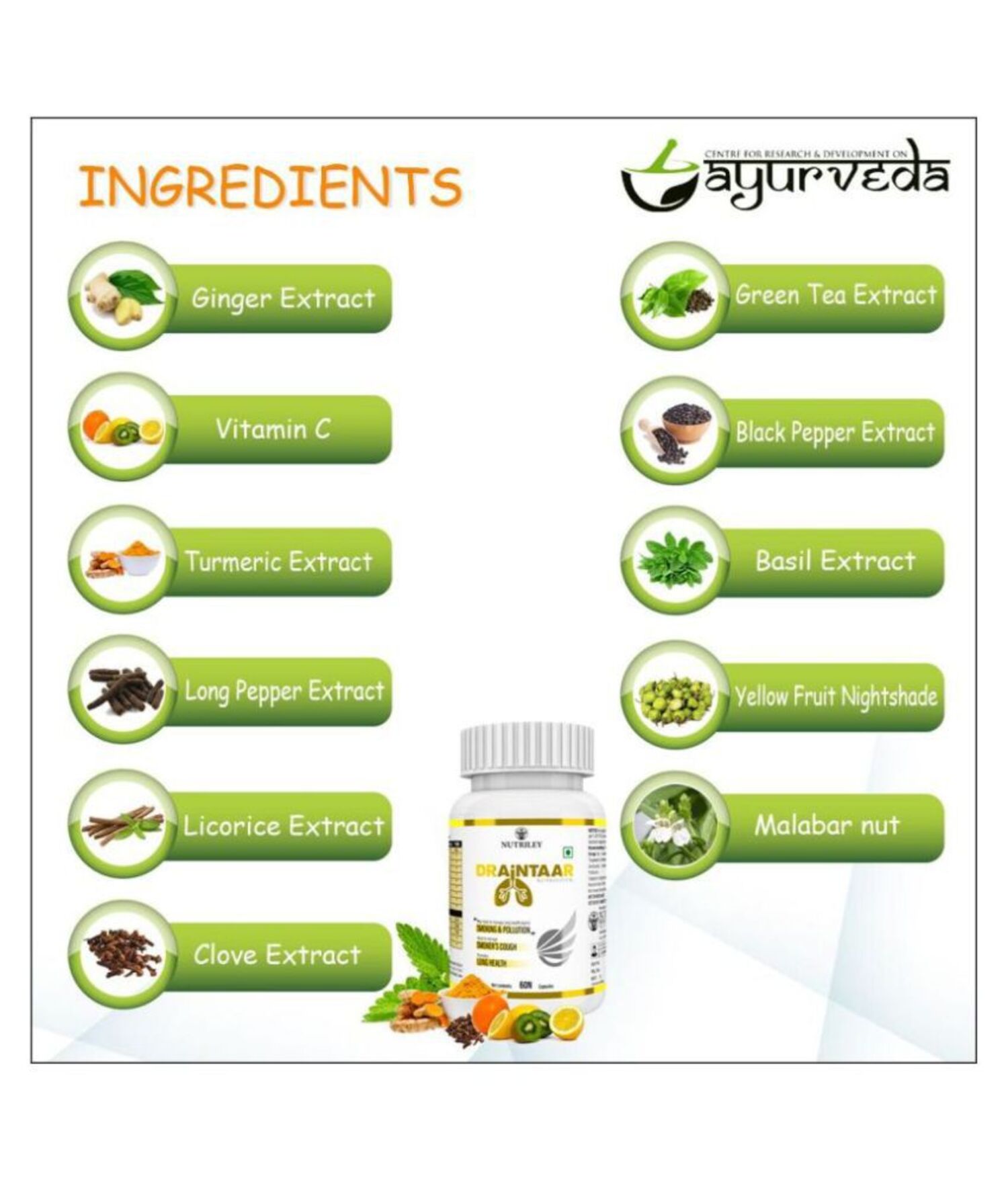 Vitamin C 40 mg, Yellow Fruit Nightshade (Solanum indicium) 75 mg, Green Tea Extract (Camellia Sinesis) 75 mg, Basil Extract (Ocimum Sanctum) 75 mg, Malabar nut (Adhatoda Vasica) 75 mg, Long Pepper Extract (Piper Longum) 25 mg, Clove Extract (Syzygum Aromaticum) 10 mg, Turmeric Extract (Curcuma Longa) 50 mg, Black Pepper Extract (Piper Nigrum) 10 mg, Licorice Extract (Glycyrrhiza Glabra) 35 mg, Ginger Extract (Zingiber Officinale) 25 mg