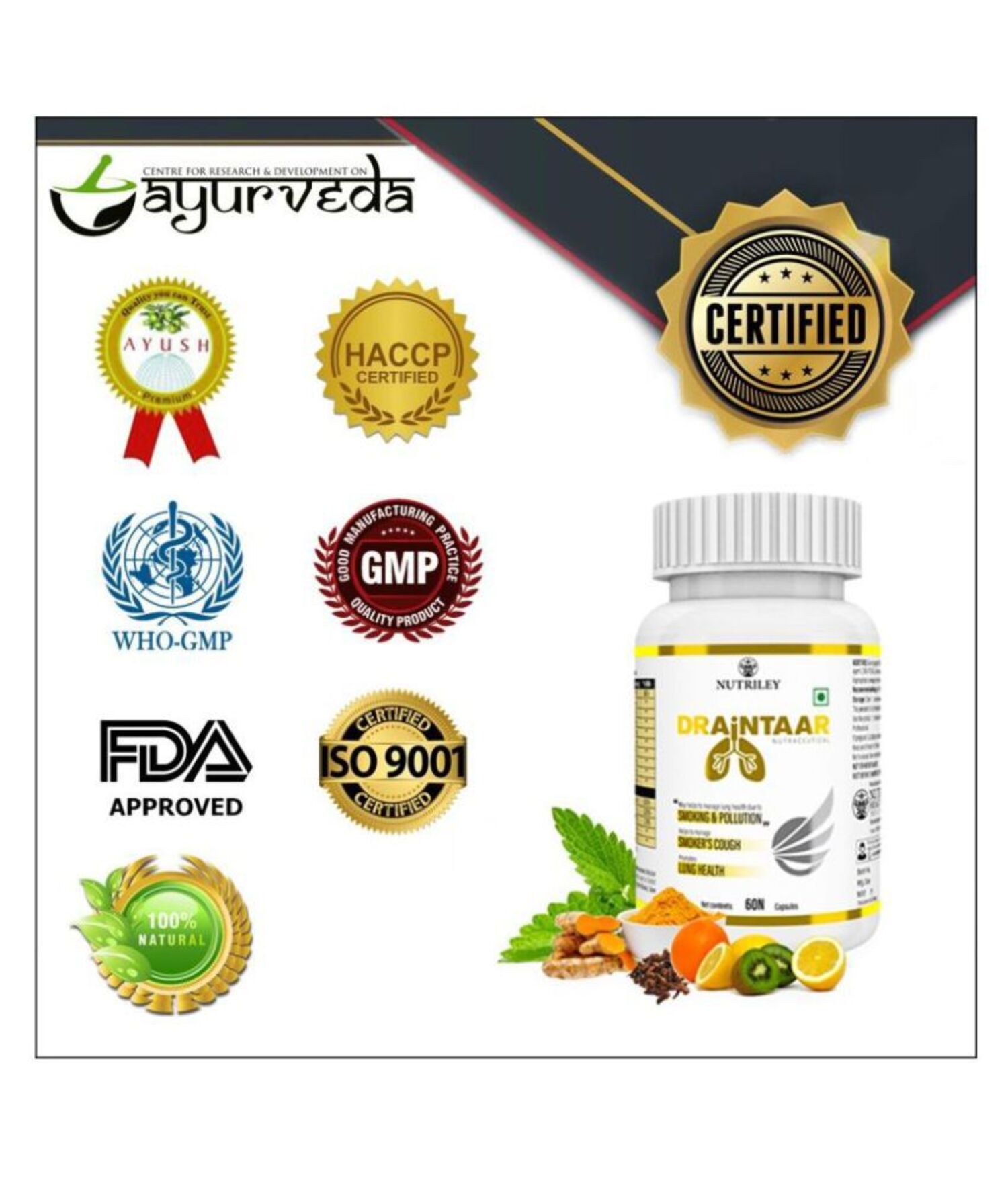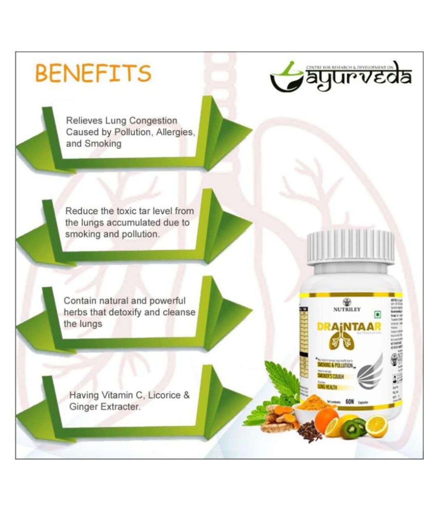 DRAINTAAR nutraceutical capsules contain natural and powerful herbs that detoxify and cleanse the lungs, heal lung tissues, and infuse vitality by improving the lung’s capacity to absorb more oxygen. Pollution and smoking significantly harm lung health. Every day, our lungs get exposed to killer pollutants, harmful chemicals, microbes, dust, pollen, allergens, primary and secondary smoke, particulate matter, vehicular emissions, smog, and heavy metals. Over time, layers after layers of these toxic substances get deposited into our lung tissues from the air, we inhale through a process called bio-magnification. For example, in case of smokers, healthy pink lungs turn black with the deposition of tar in the lungs. Even synthetic deodorants, perfumes and room fresheners can contain chemicals that harm our lungs. Unhealthy food habits, poor sleep, stress, emotional insecurity, lifestyle changes and genetic factors also impact overall lung health.