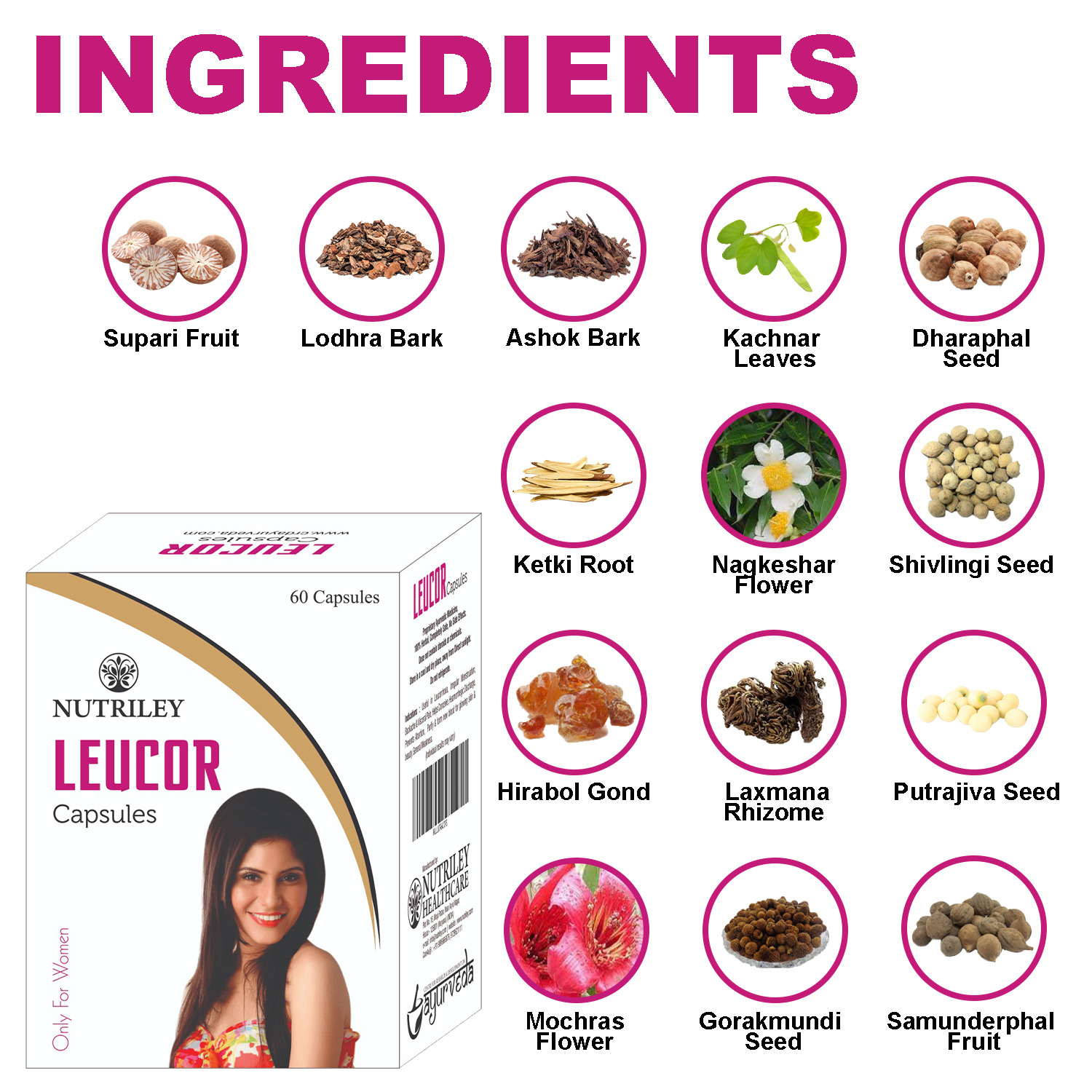 Leucorrhoea Capsules for Women help with PCOS symptoms and is 100% vegetarian, made with natural active ingredients. Works on Erosion and excoriation of cervix with discharge like white egg. Chronic yellow Vaginal discharge. All kinds of white discharge in women complaints. Loss of appetite & physical weakness. Helpful in problems related with Hormonal Imbalance. Leucorrhoea may be offensive and excoriating with bearing down sensation in pelvic region and may be accompanied by pains in the abdomen and pruritus. Restores female reproductive organ wellness. Reduce the pain, swelling and infection. Removes Bad Odor & Dryness.