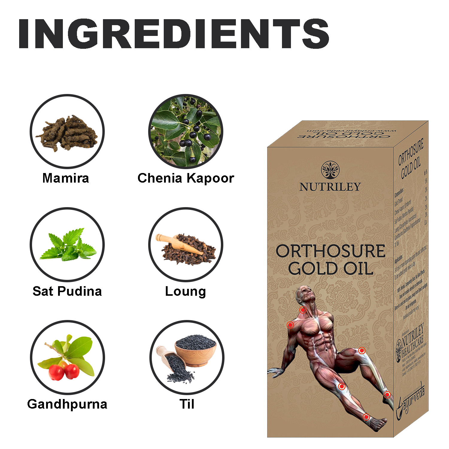 Mamira (Gold thread/Coptis teeta will) 5%, Chenia Kapoor (Cinnamomum Camphora Nees & Emberm) 3%, Sat Pudina (Mentha Piperata) 2%, Loung (Caryophyllus Aromaticus) 2%, Gandhpurna (Gaultheria Fragrantissima) 3%, Til (Sesamum Indica) Q.S.